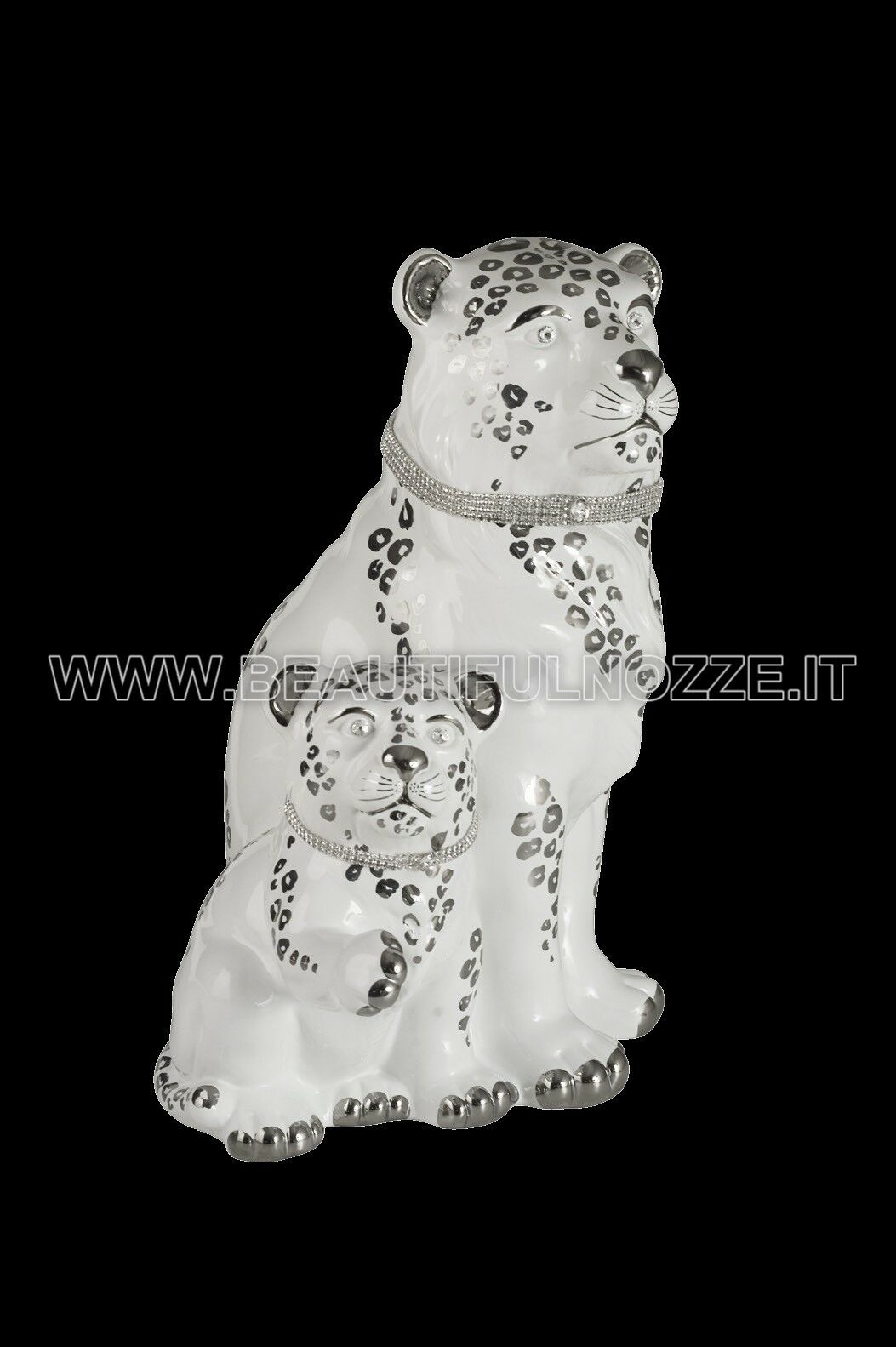 COPPIA LEOPARDI IN CERAMICA BIANCO PLATINO CON DECORI E CRISTALLI SWAROVSKI