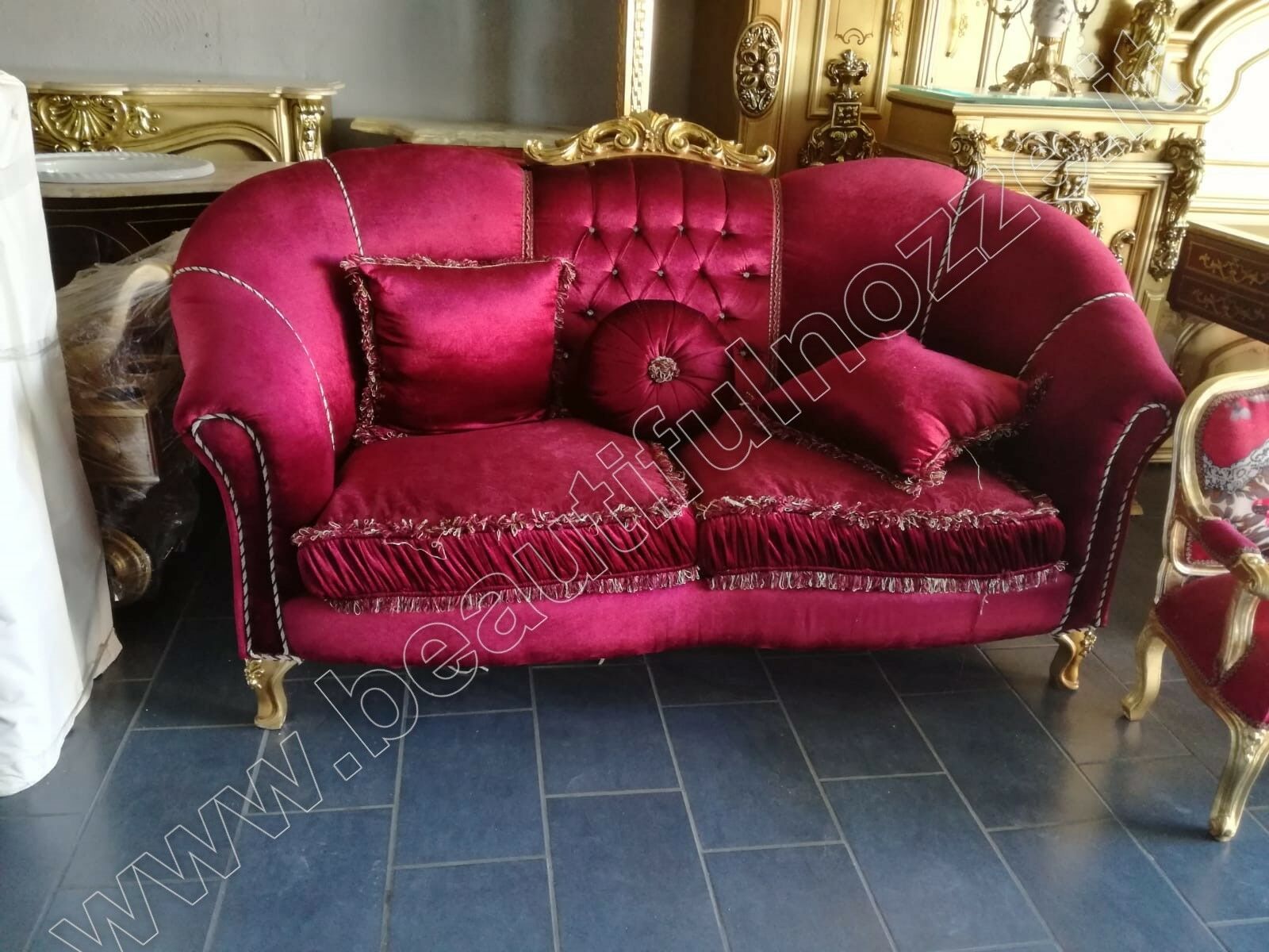 DIVANO 2 POSTI IN LEGNO FOGLIA ORO E TESSUTO IMBOTTITO ROSSO CON CRISTALLI