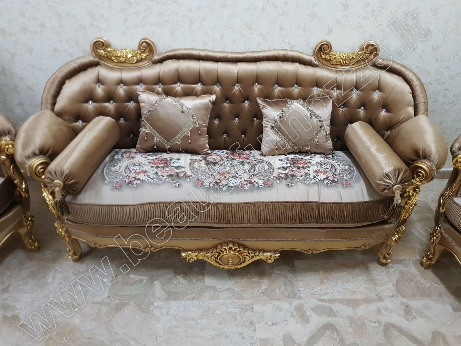 DIVANO 3 POSTI IN LEGNO FOGLIA ORO E TESSUTO ORO CON CRISTALLI