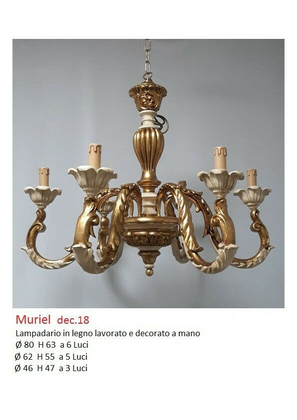 LAMPADARIO IN LEGNO 5 LUCI AVORIO E ORO