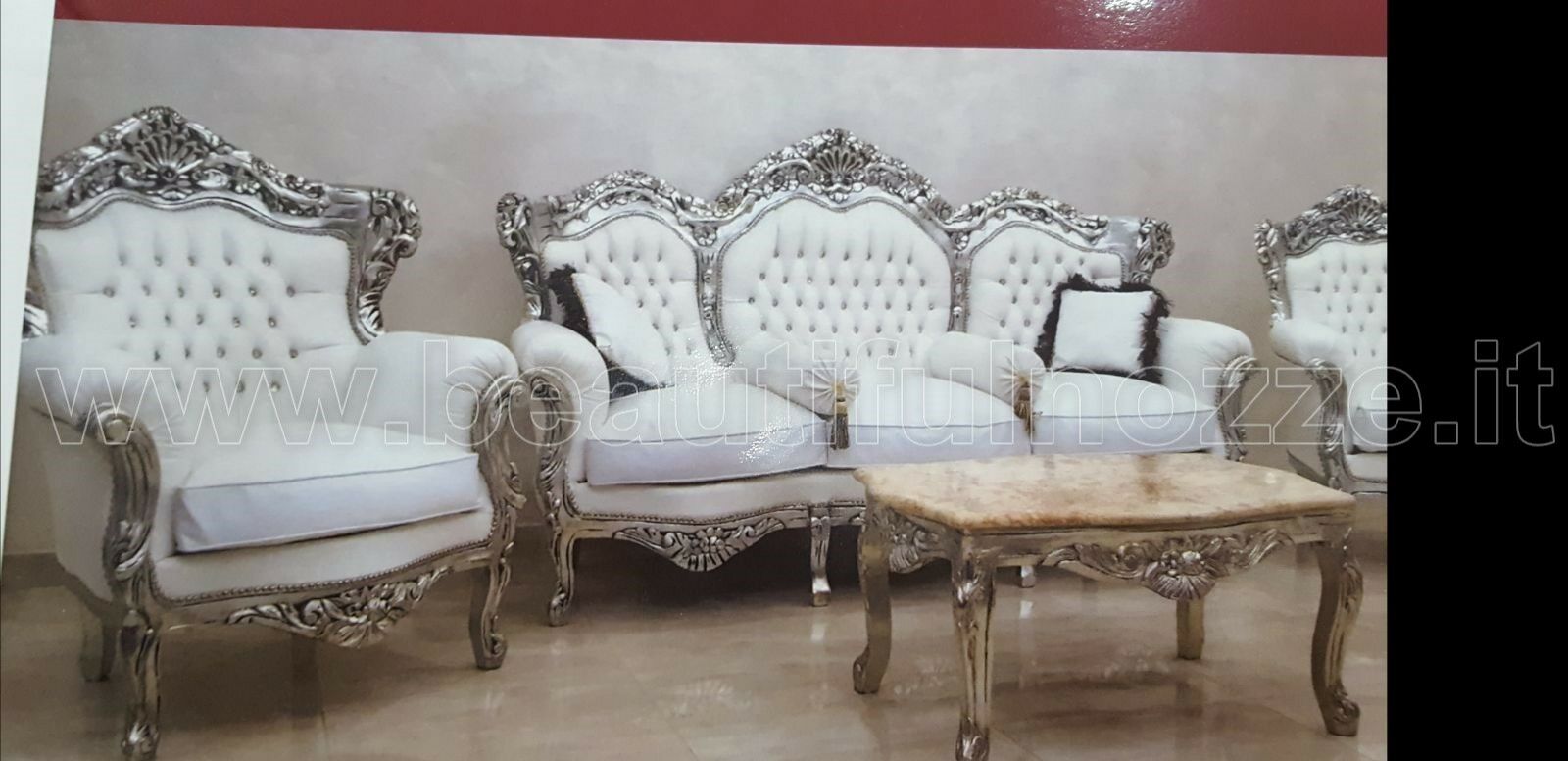 SALOTTO COMPLETO IN LEGNO FOGLIA ARGENTO E ECOPELLE CON CRISTALLI