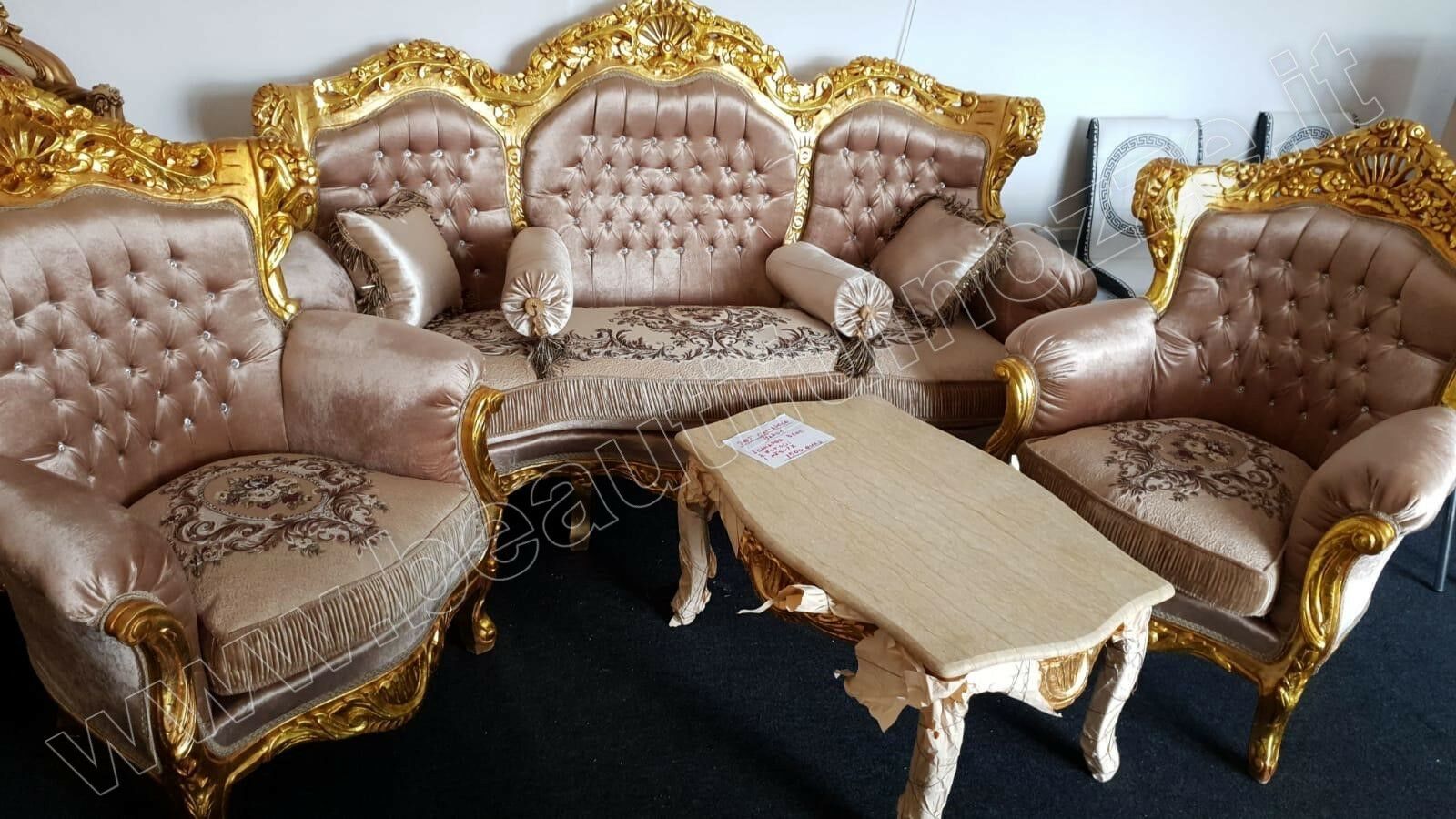 SALOTTO COMPLETO IN LEGNO FOGLIA ORO E TESSUTO ORO CON CRISTALLI