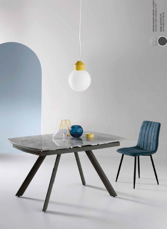tavolo da pranzo moderno allungabile base antracite in metallo e piano in pietra effetto marmo grigio lucido chuso L 140 cm