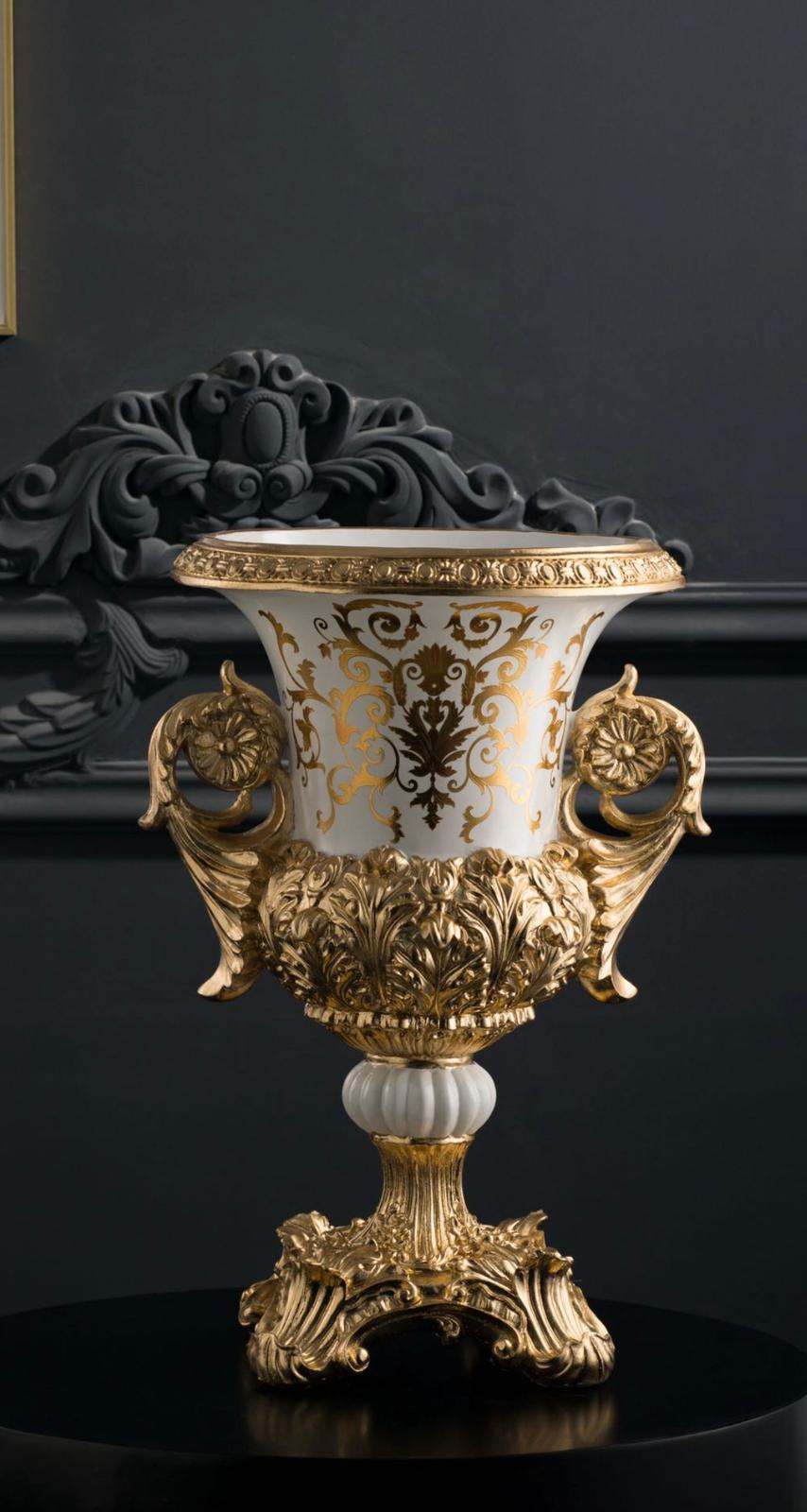 vaso con manici in ceramica avorio con decori oro H 60 cm