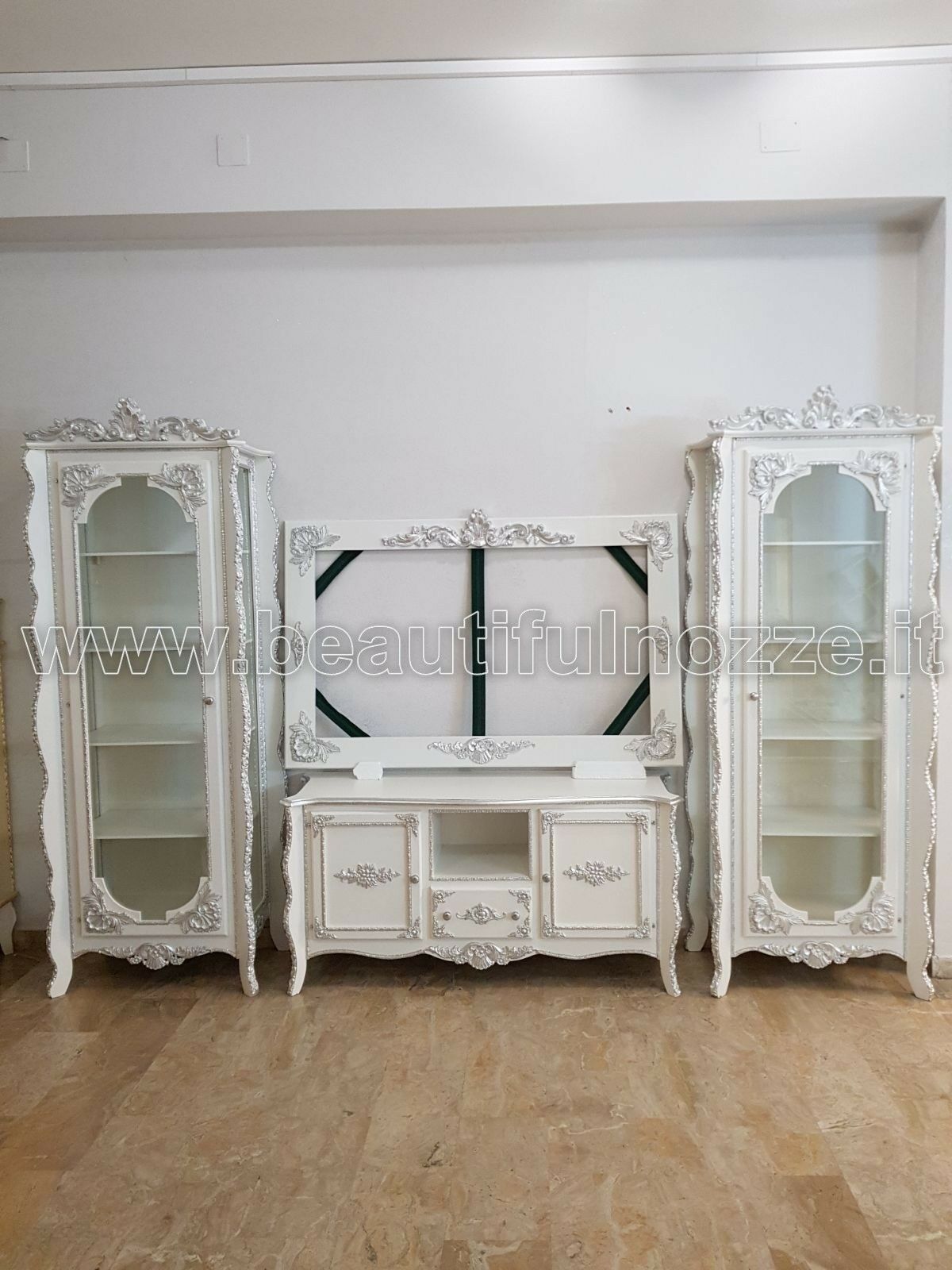 2 VETRINE 1 ANTA + MOBILE PORTA TV + CORNICE TV IN LEGNO AVORIO E FOGLIA ARGENTO