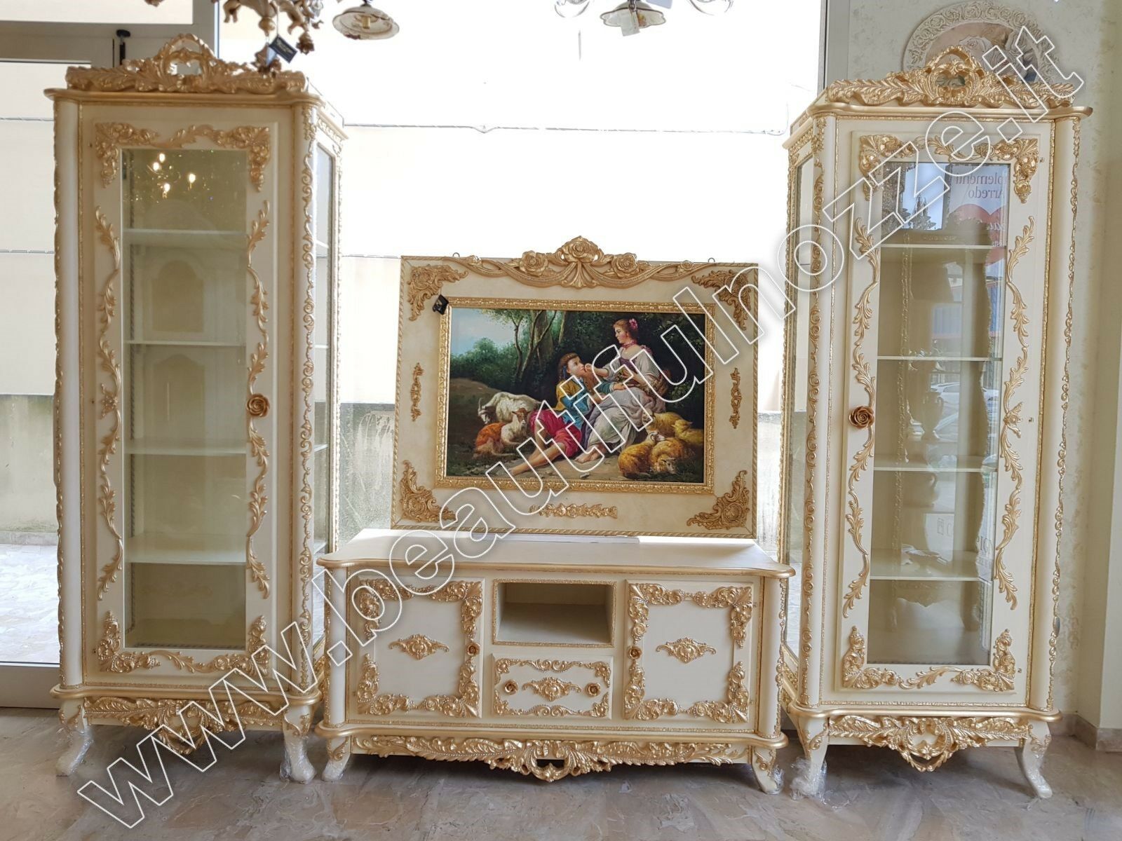 2 VETRINE 1 ANTA + MOBILE PORTA TV IN LEGNO PANNA E FOGLIA ORO CON CRISTALLI