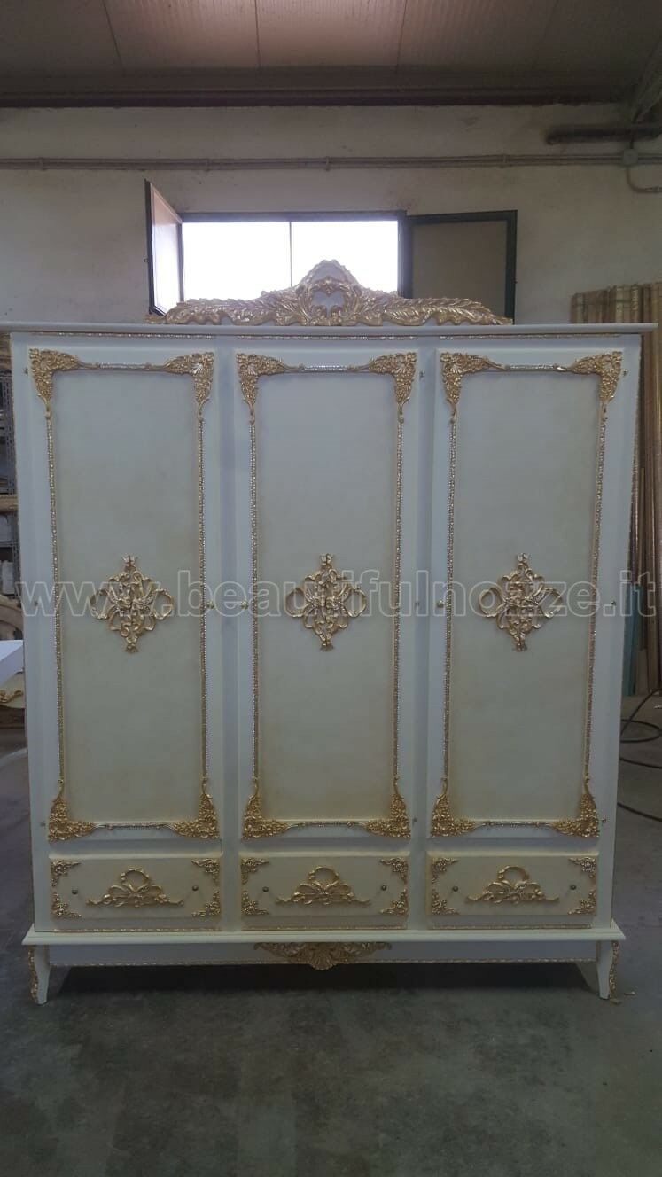 ARMADIO 3 ANTE IN LEGNO AVORIO E ORO CON CIMASA E DECORI ORO CAMERA DA LETTO