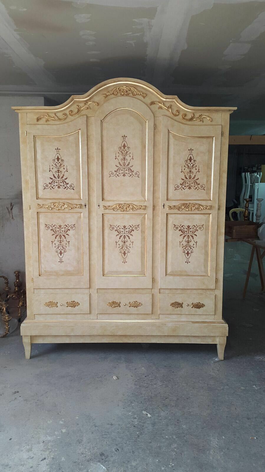 ARMADIO 3 ANTE IN LEGNO AVORIO E ORO CON DECORI ARREDO CASA CAMERA DA LETTO
