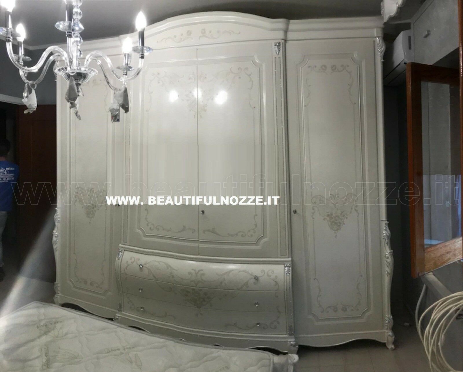 ARMADIO 4 ANTE E 3 CASSETTI IN LEGNO BIANCO E DECORI IN FOGLIA ARGENTO