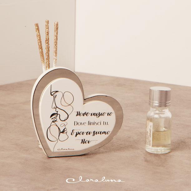 Bomboniera matrimonio Claraluna 2023  profumatore cuore con coppia, bianco con bordo specchiato, incluso di stecche oro e profumo