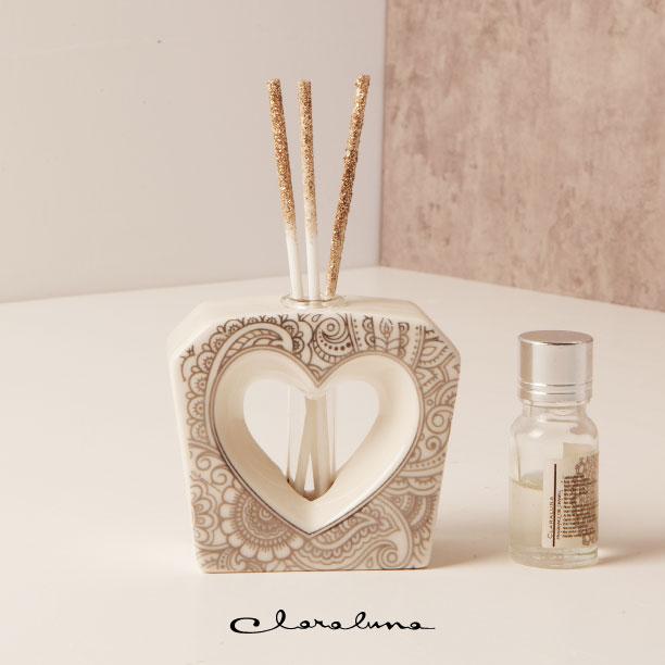 Bomboniera matrimonio Claraluna 2023 profumatore cuore decorato il tutto in porcellana, inclusa di stecche dorate e profumo.