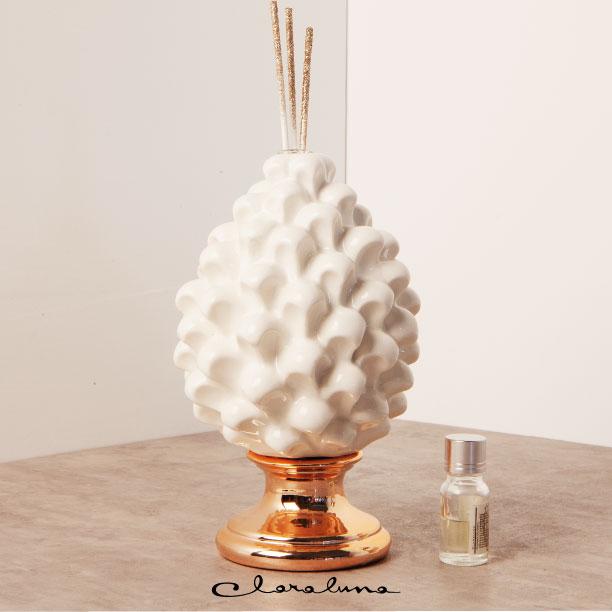 Bomboniera matrimonio Claraluna 2023 profumatore pigna bianca con piede oro grande il tutto in porcellana, inclusa di stecche dorate e profumo