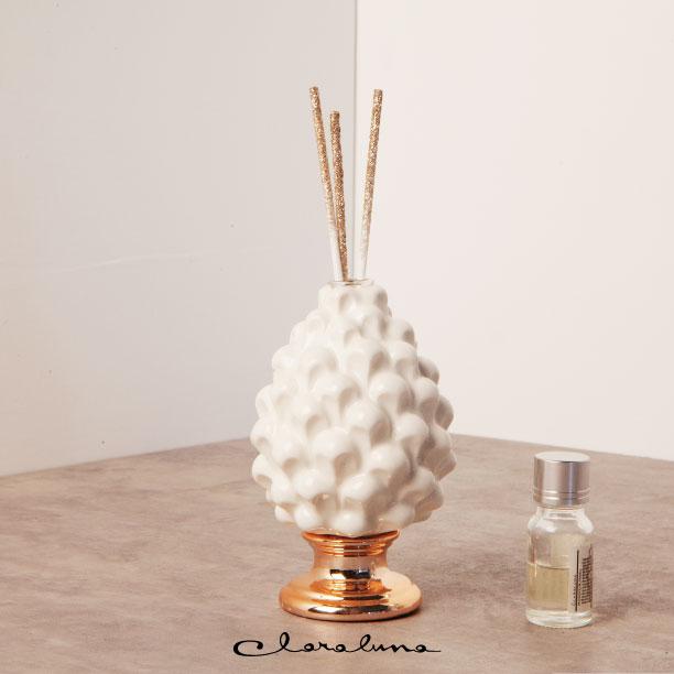Bomboniera matrimonio Claraluna 2023 profumatore pigna bianca con piede oro piccola il tutto in porcellana, inclusa di stecche dorate e profumo.