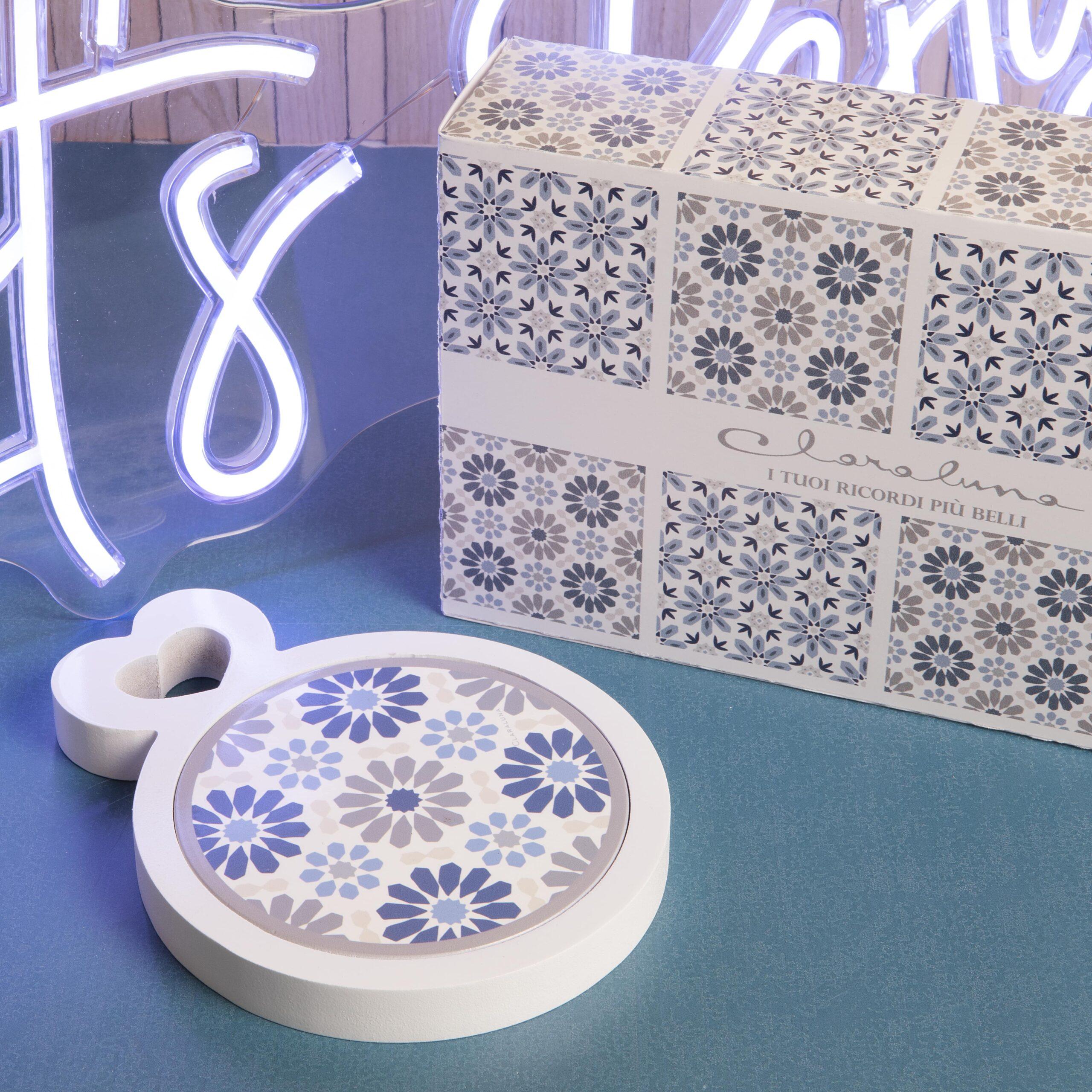 bomboniere matrimonio 2024 tagliere grande bianco fiori blu e tortora 24044