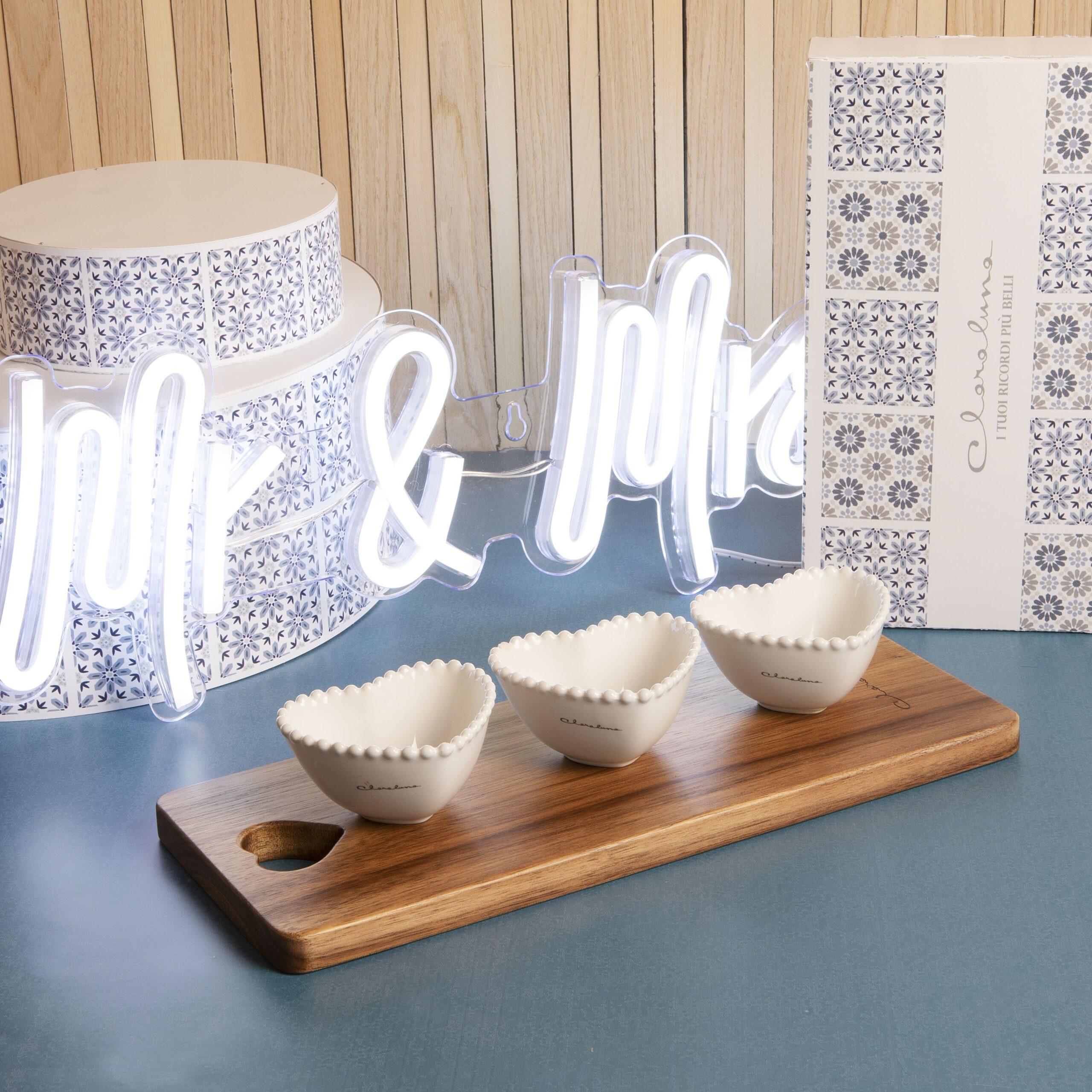 bomboniere matrimonio 2024 vassoio in legno con 3 ciotole cuore in ceramica 24066