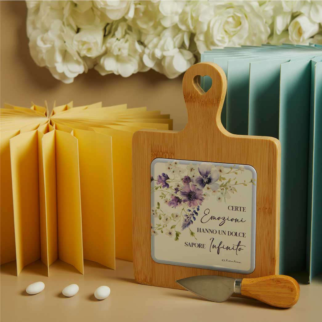 BOMBONIERE MATRIMONIO 2026 TAGLIERE ACACIA DECORO FLOREALE LILLA CON COLTELINO 26085-C
