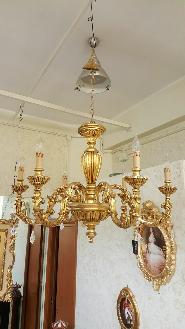 BRITTON LAMPADARIO SOSPENSIONE IN LEGNO FOGLIA ORO 6 LUCI DA SOFFITO