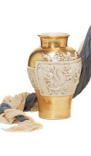 CACHEPOT VASO MEDIO CON PUTTI ANGELI IN RILIEVO IN CERAMICA FOGLIA ORO AVORIO