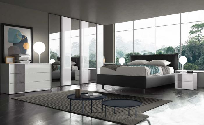 camera completa bianco lucido ed effetto cemento con letto contenitore
