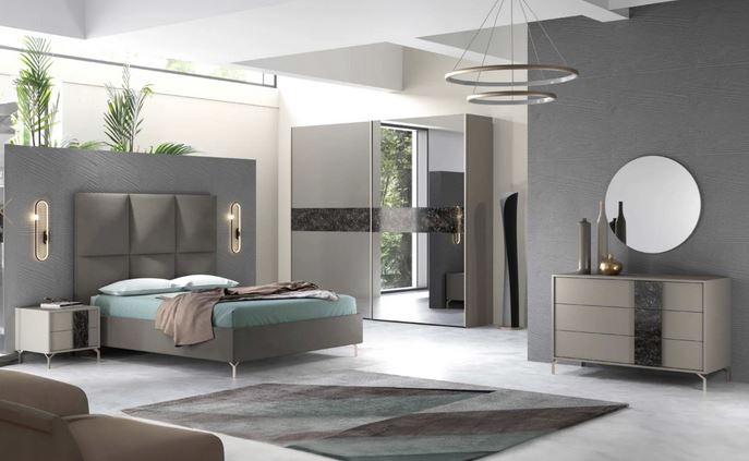 camera completa tortora con inserti in vetro effetto marmorizzato con letto contenitore