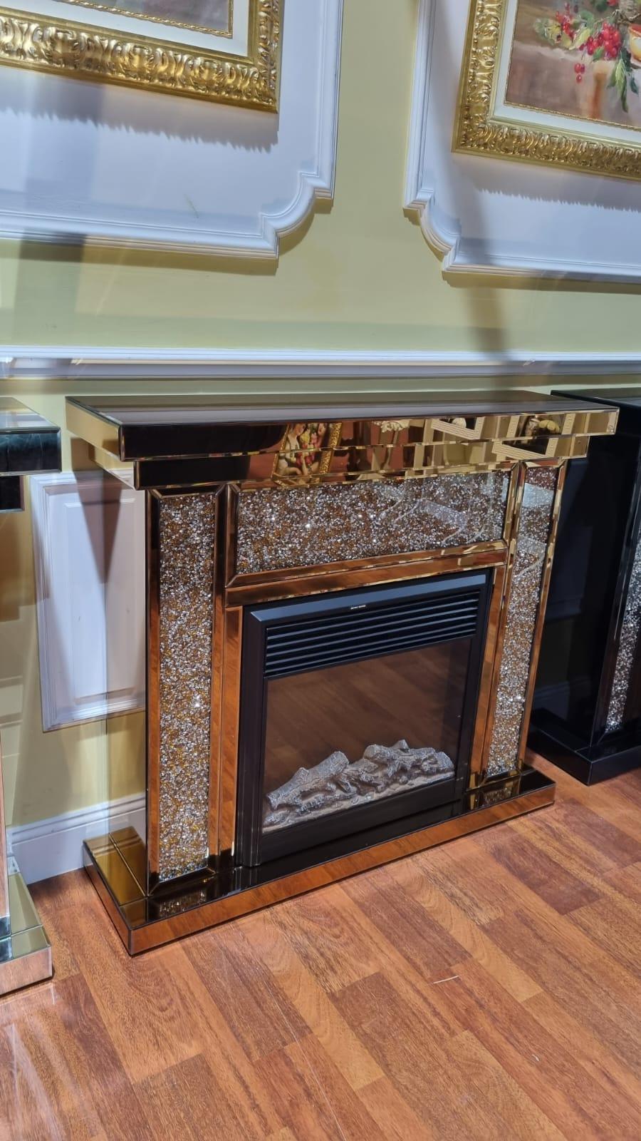 CAMINETTO MODERNO ELETTRICO IN VETRO SPECCHIATO BRONZATO E CRISTALLO