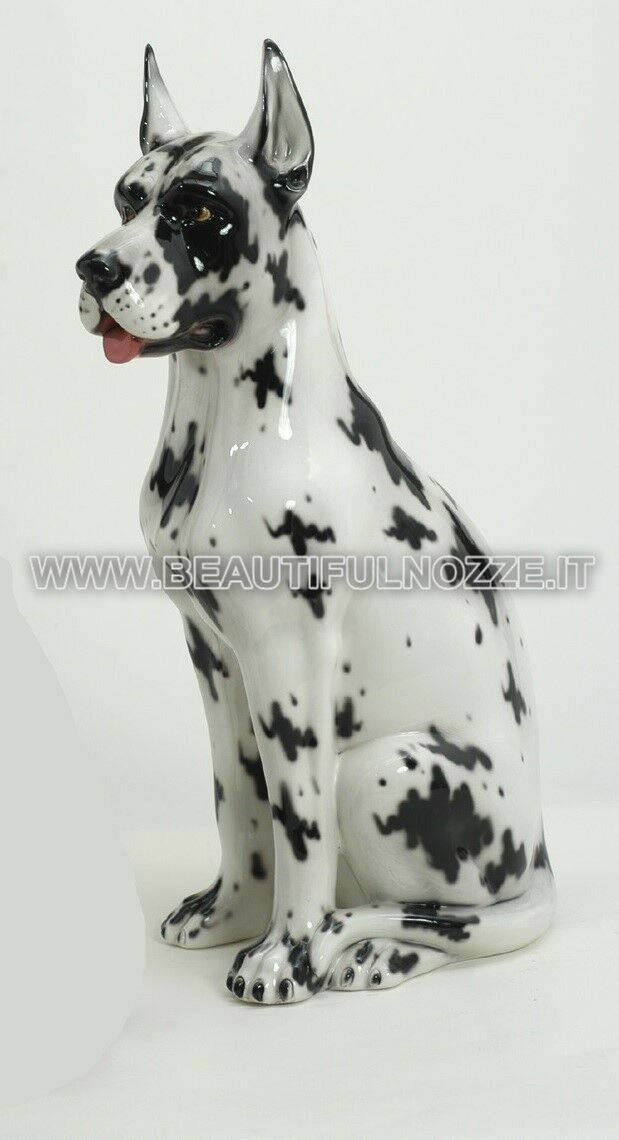 CANE ALANO ARLECCHINO MEDIO SEDUTO IN CERAMICA BIANCA CON MACCHIE NERE ANIMALI