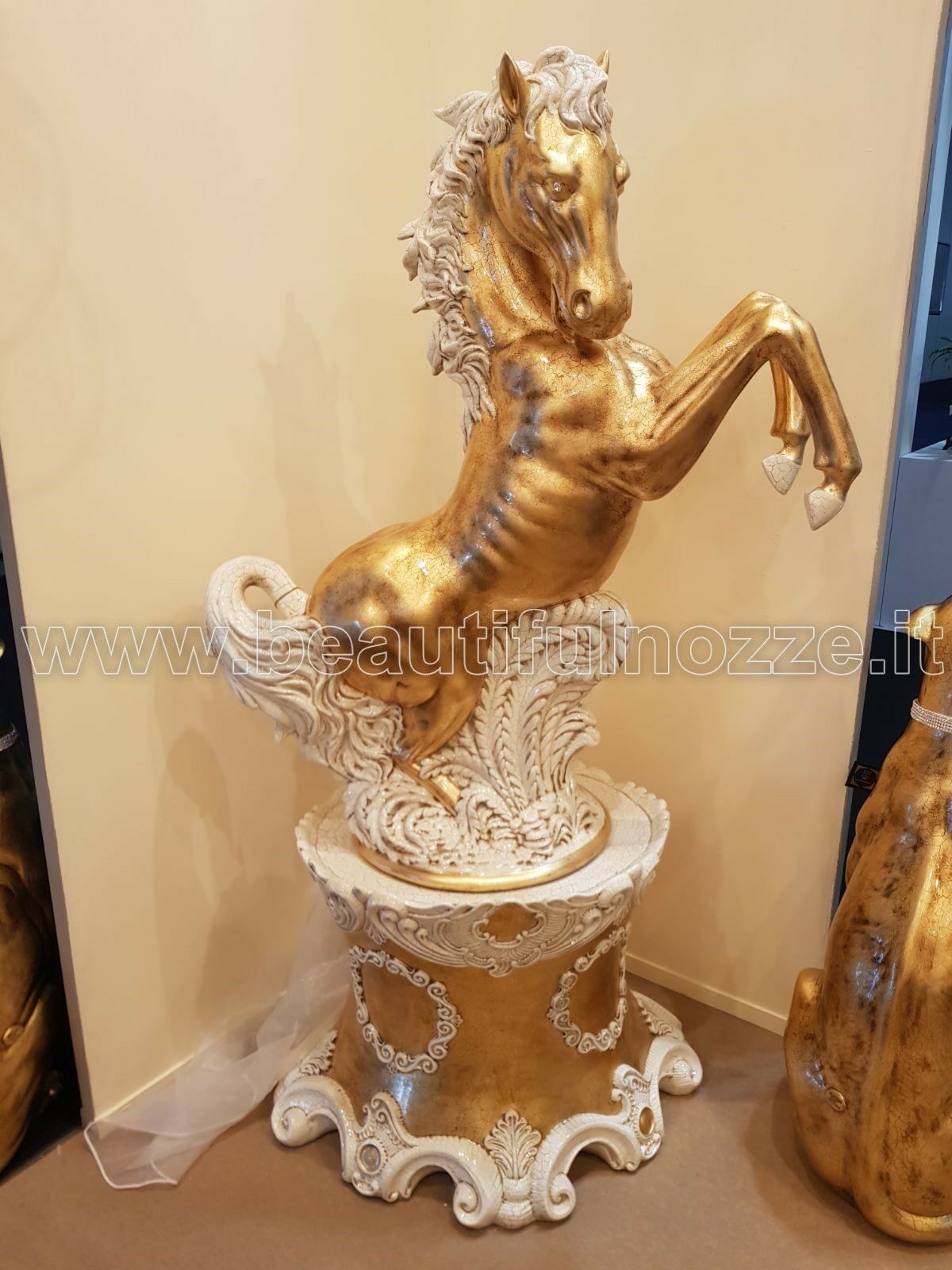 CAVALLO RAMPANTE SU COLONNA IN CERAMICA FOGLIA ORO CON CRISTALLI