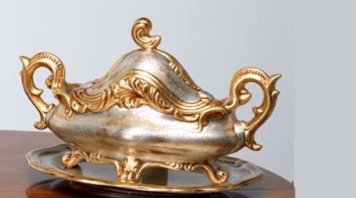 CENTROTAVOLA ZUPPIERA OVALE CON VASSOIO IN CERAMICA FOGLIA ORO ARGENTO