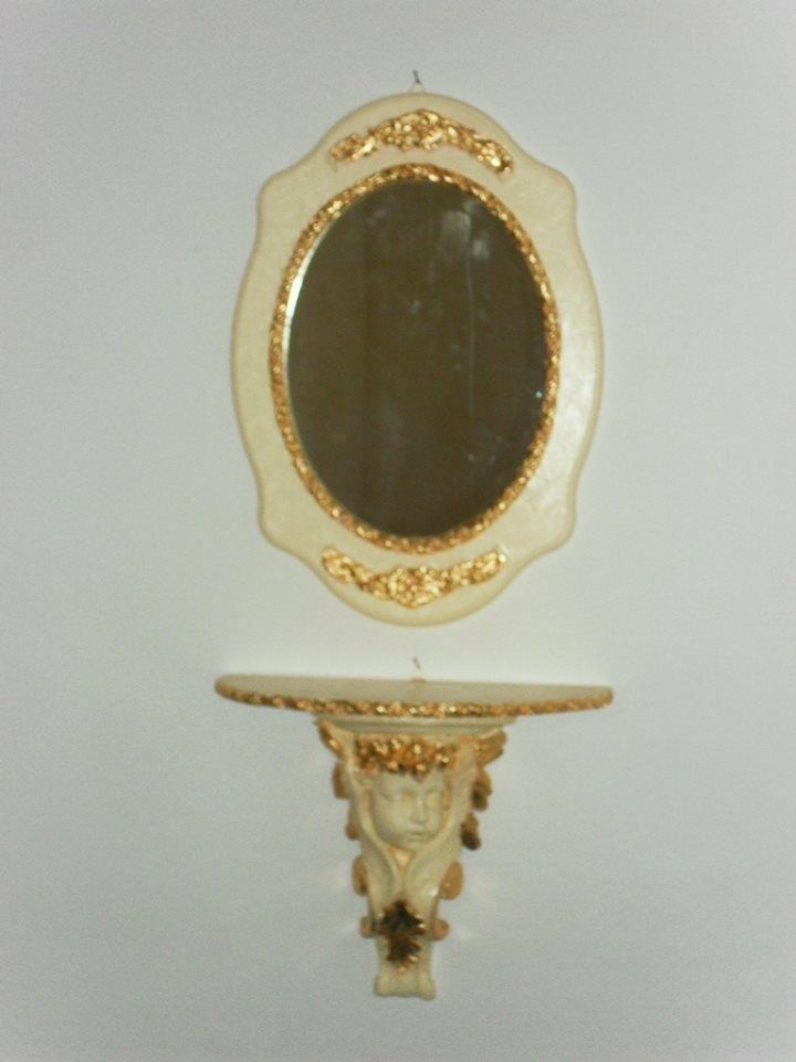 CONSOLINA CONSOLLE E SPECCHIO DA PARETE IN LEGNO AVORIO E FOGLIA ORO ENTRATINA