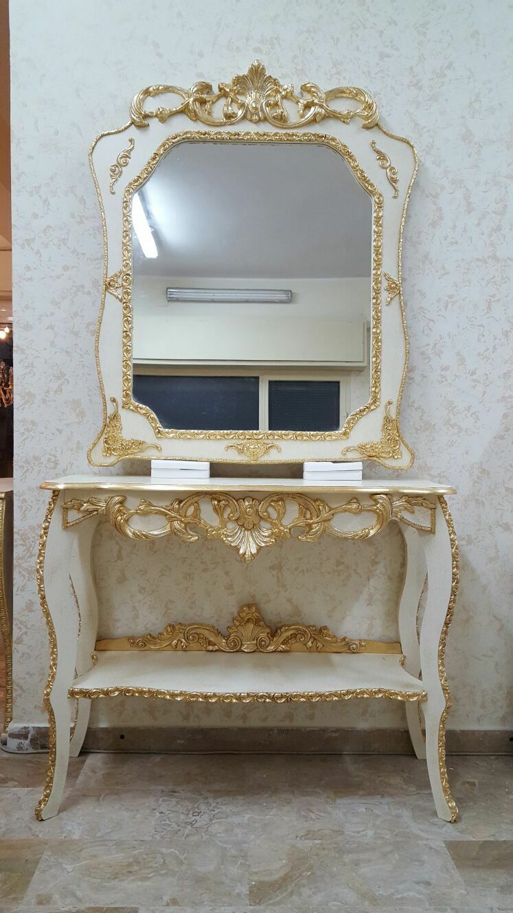 CONSOLLE E SPECCHIO IN LEGNO AVORIO E FOGLIA ORO CON CRISTALLI MOBILI SOGGIORNO