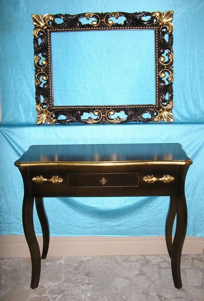 CONSOLLE E SPECCHIO IN LEGNO DECORO NOCE E FOGLIA ORO ENTRATINA SOGGIORNO