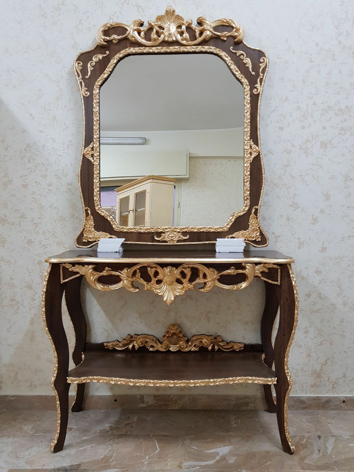 CONSOLLE E SPECCHIO IN LEGNO NOCE E FOGLIA ORO CON CRISTALLI MOBILI SOGGIORNO