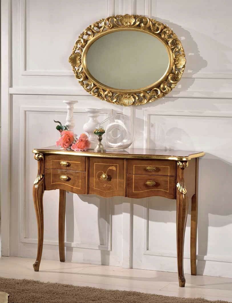CONSOLLE E SPECCHIO OVALE IN LEGNO NOCE E FOGLIA ORO INGRESSO ARREDO CASA