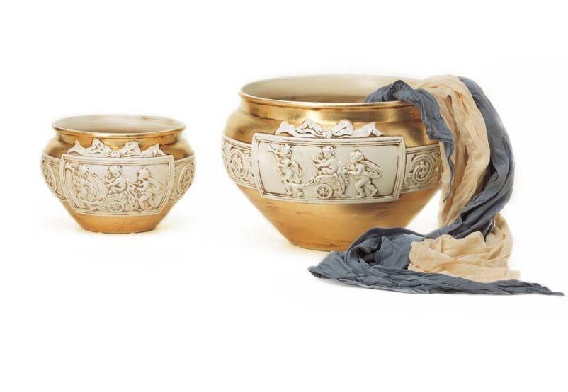 COPPIA CACHEPOT VASI PICCOLO GRANDE PUTTI ANGELI IN RILIEVO CERAMICA FOGLIA ORO