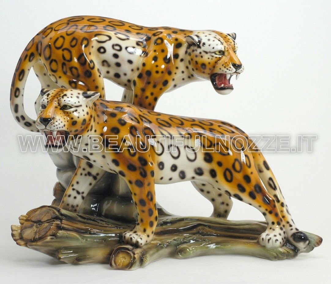 COPPIA LEOPARDI RUGGENTI SU TRONCO IN CERAMICA CON MACCHIE ANIMALI PANTERA LEONE