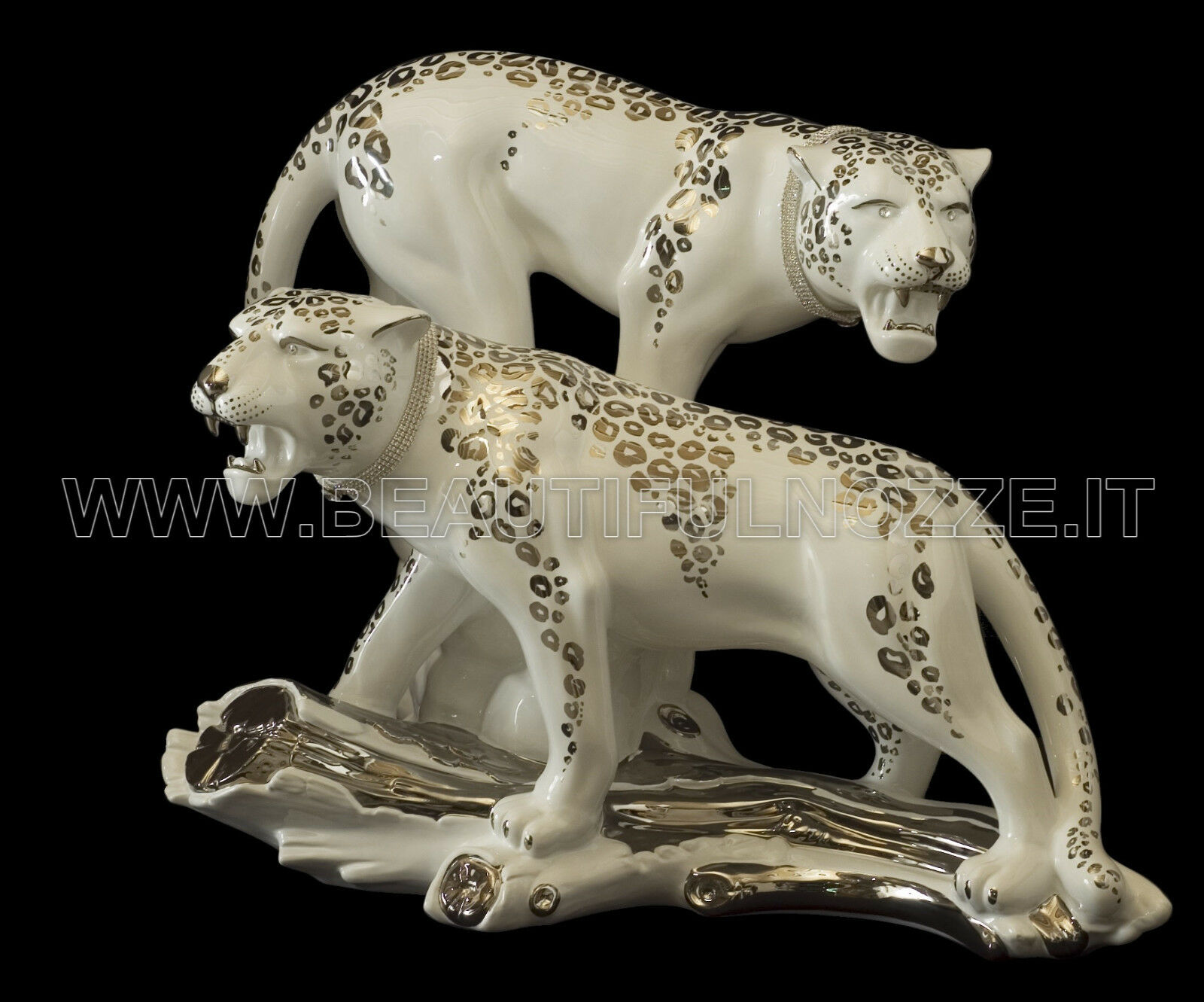 COPPIA LEOPARDI SU TRONCO IN CERAMICA BIANCO PLATINO CON CRISTALLI SWAROVSKI
