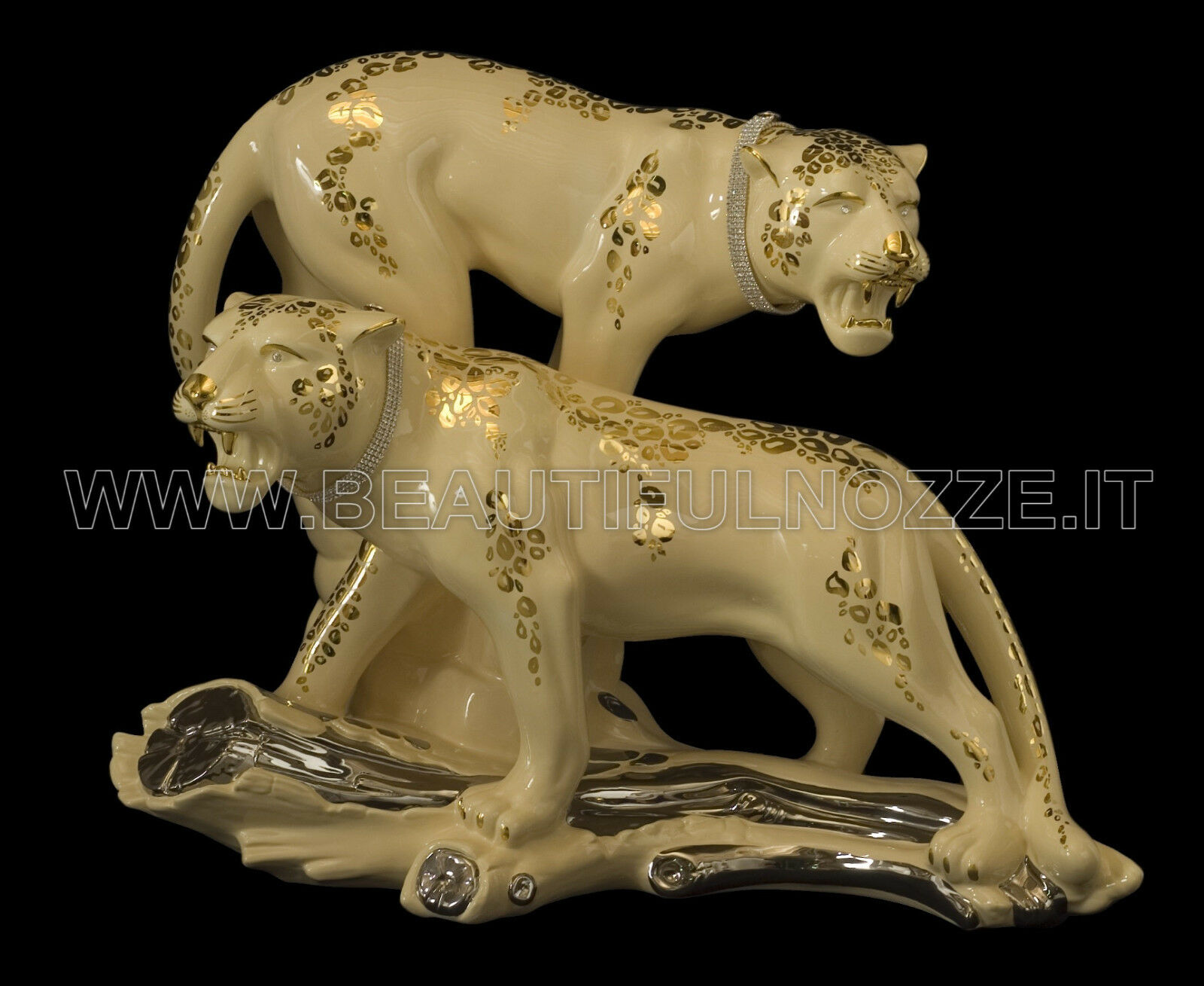 COPPIA LEOPARDI SU TRONCO IN CERAMICA CREMA E ORO CON CRISTALLI SWAROVSKI
