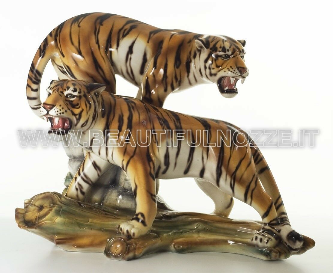COPPIA TIGROTTI RUGGENTI SU TRONCO IN CERAMICA TIGRATI ANIMALI PANTERA LEONE