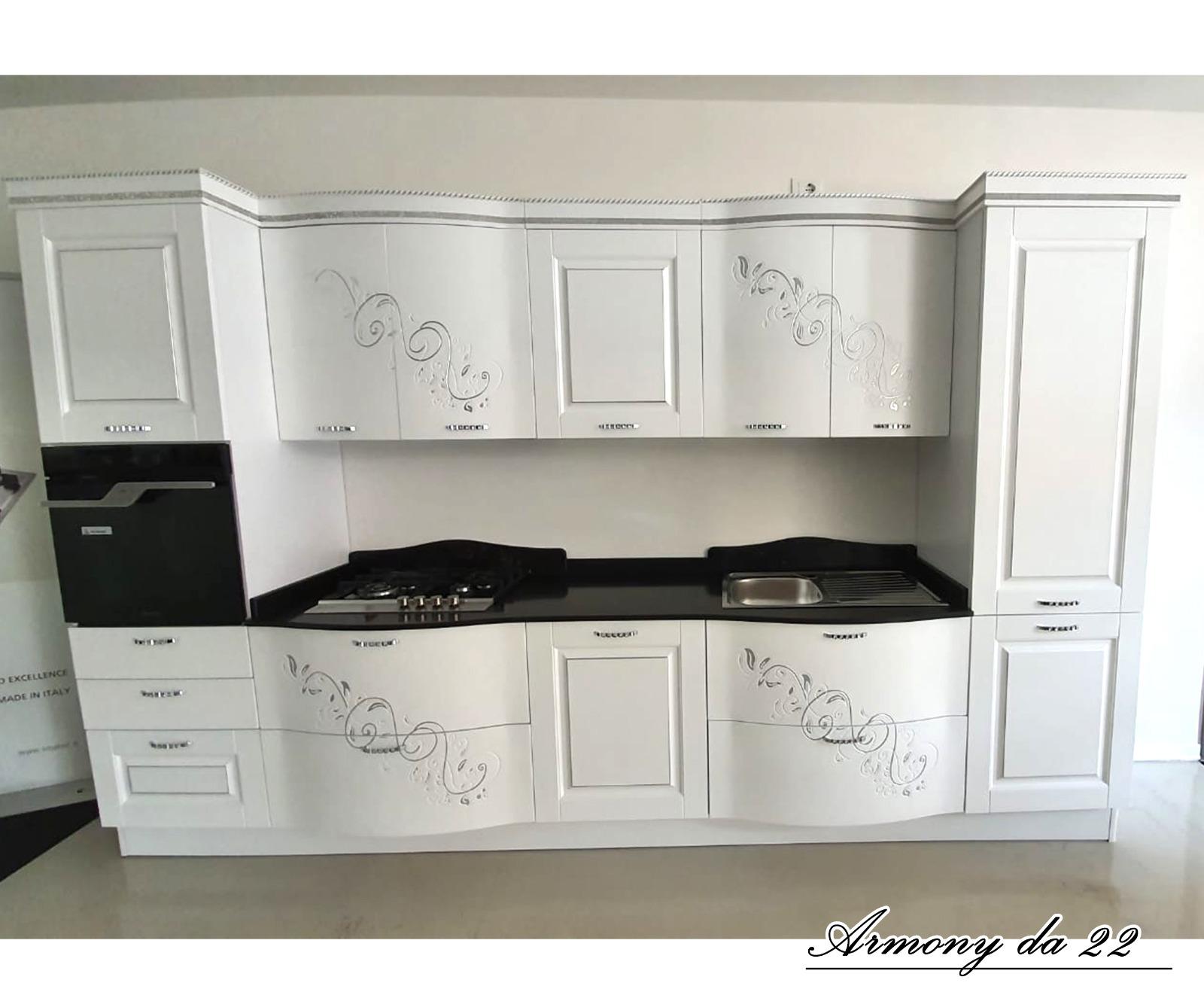 cucina componibile su misura bianca con finiture argento decoro armony 22