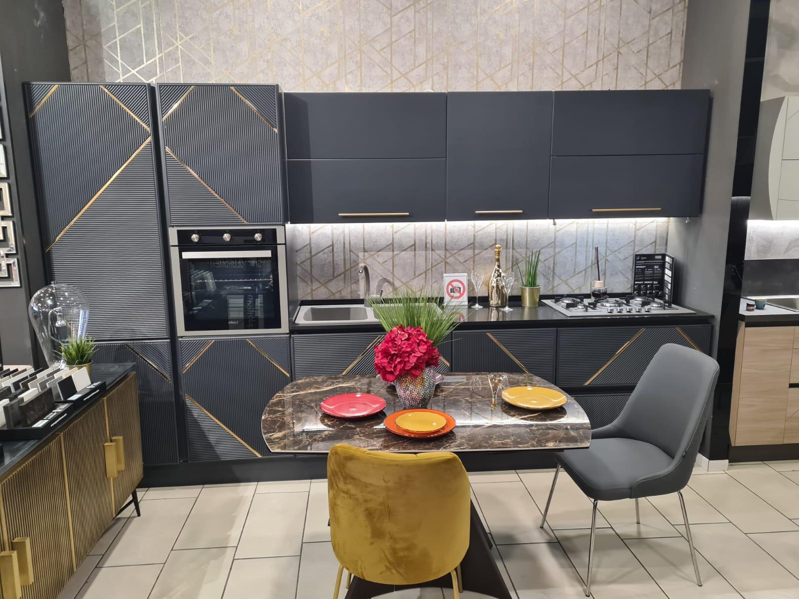 cucina moderna componibile su misura anta liscia nera con decoro a strisce oro e effetto specchio