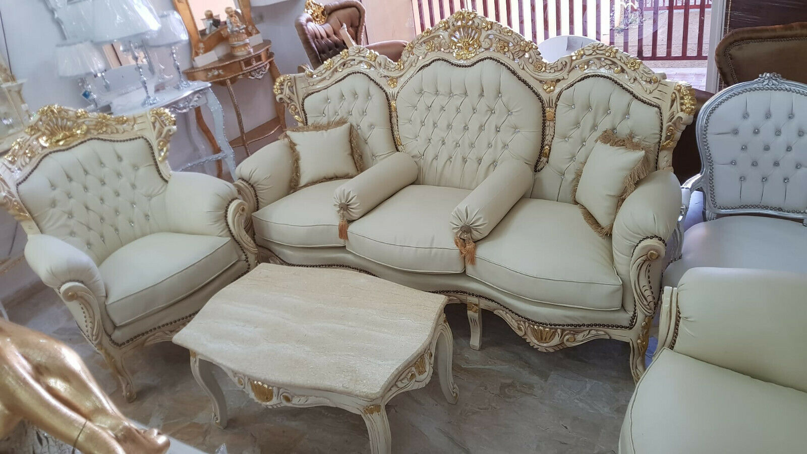 DIVANO 3 POSTI + 2 POLTRONE + TAVOLINO LEGNO AVORIO ORO ECOPELLE AVORI CRISTALLI