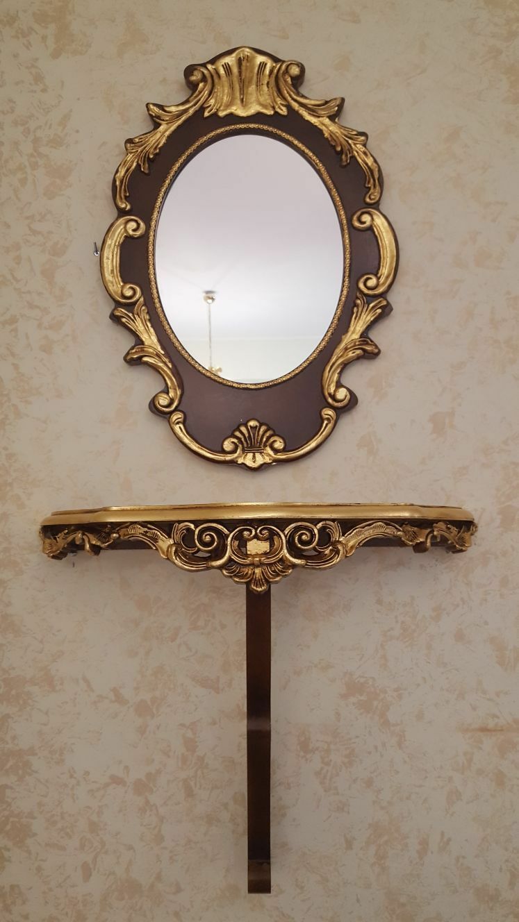 ENTRATINA CONSOLINA CONSOLLE E SPECCHIO DA PARETE LEGNO DECORO NOCE E FOGLIA ORO