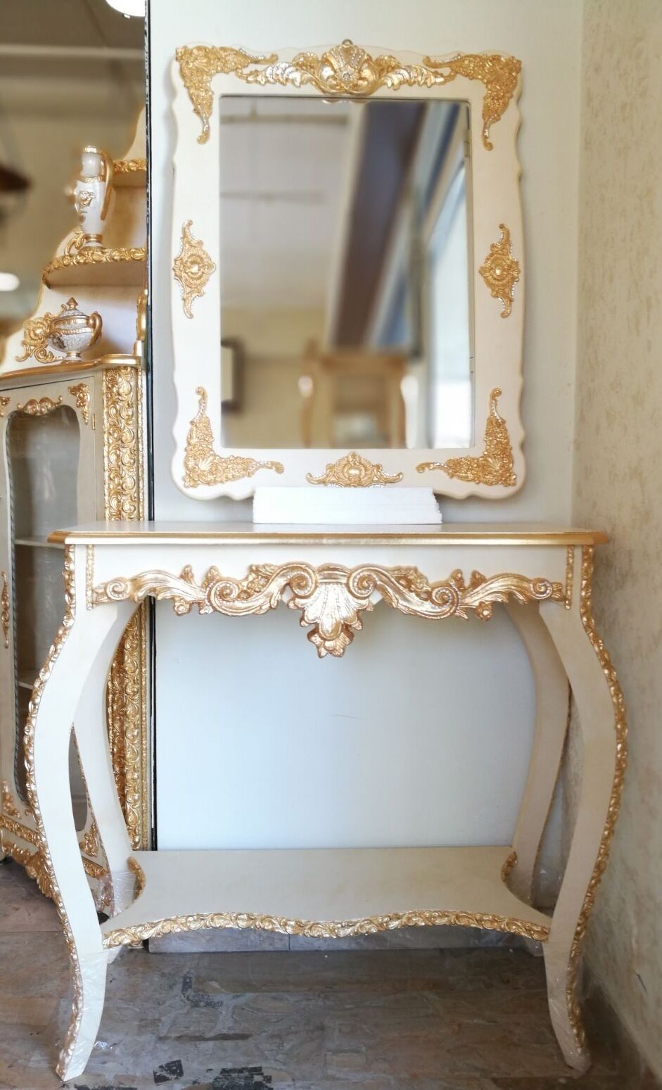 ENTRATINA CONSOLLE E SPECCHIO IN LEGNO PANNA E FOGLIA ORO CON CRISTALLI STRASS