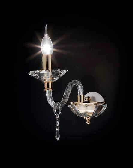 FIAMMA APPLIQUE IN CRISTALLO E VETRO TRASPARENTE CON FINITURA ORO 1 LUCE