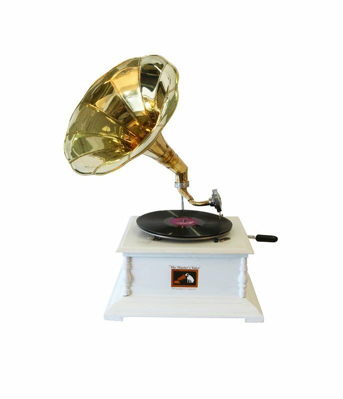 GRAMMOFONO QUADRATO IN LEGNO BIANCO CON TROMBA IN OTTONE
