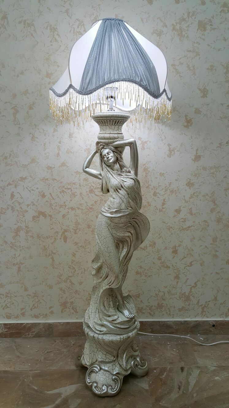 LAMPADA 1 LUCE DONNA AL VENTO STATUE STILE ANTICO CERAMICA BIANCO E ARGENTO