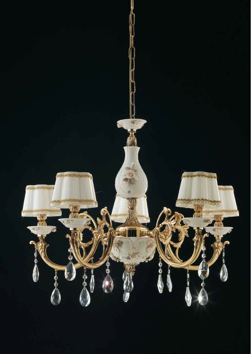 LAMPADARIO 5 LUCI IN OTTONE FUSIONE BAGNO ORO E CERAMICA CON PARALUMI