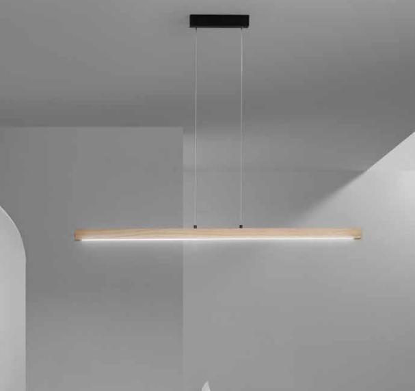 Sospensione a barra realizzata in legno naturale e caratterizzata da una forte anima luminosa a LED, cavi regolabili in acciaio