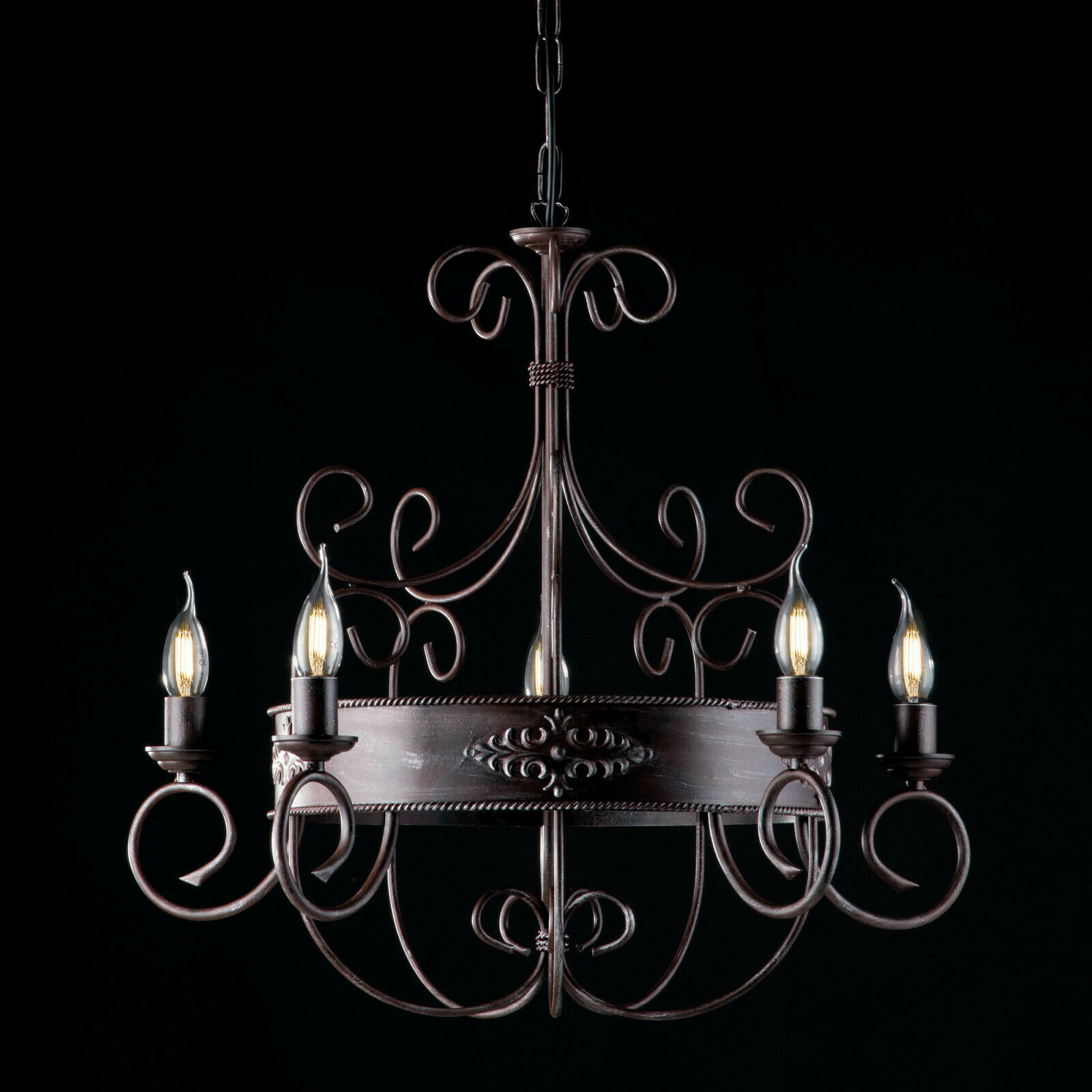 Lampadario in ferro laccato nero con decori ruggine 5 luci con fregi