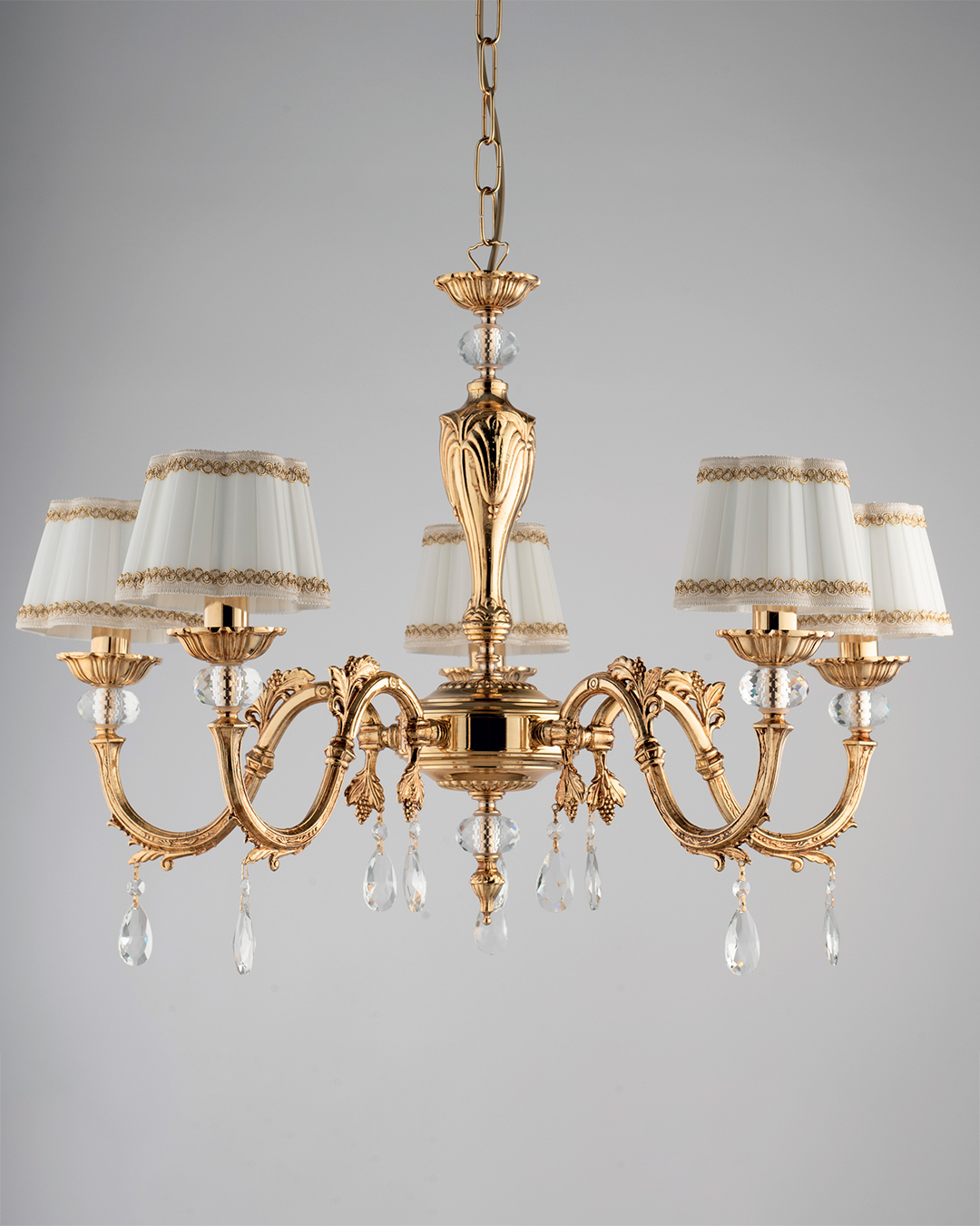 LAMPADARIO IN FUSIONE ORO 5 LUCI CON PARTICOLARI IN CRISTALLO PARALUMI TESSUTO
